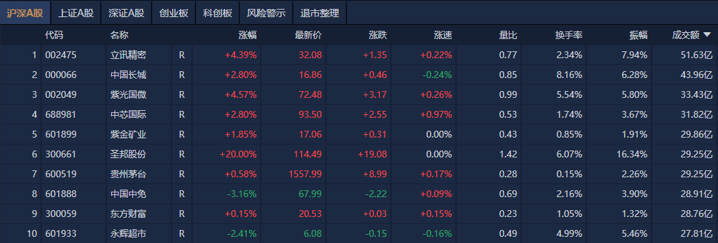 沪深两市半日成交额7714万亿元,较上个交易日缩量3411亿。个股方面,立讯精密成交额超51亿元居首,中国长城、紫光国微、中芯国际成交额靠前。