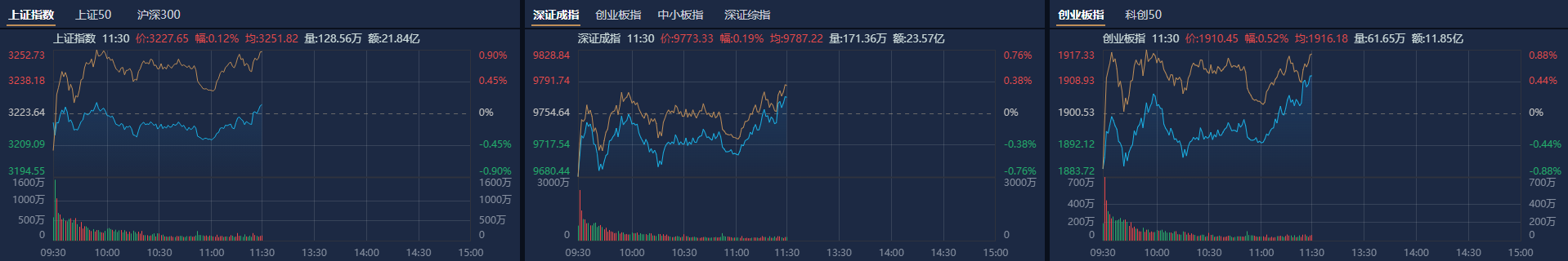 市场早盘震荡反弹,三大指数小幅上涨,科创50指数涨近2%。南财金融终端显示,截至早盘收盘,沪指涨0.12%,深成指涨0.19%,创业板指涨0.52%。