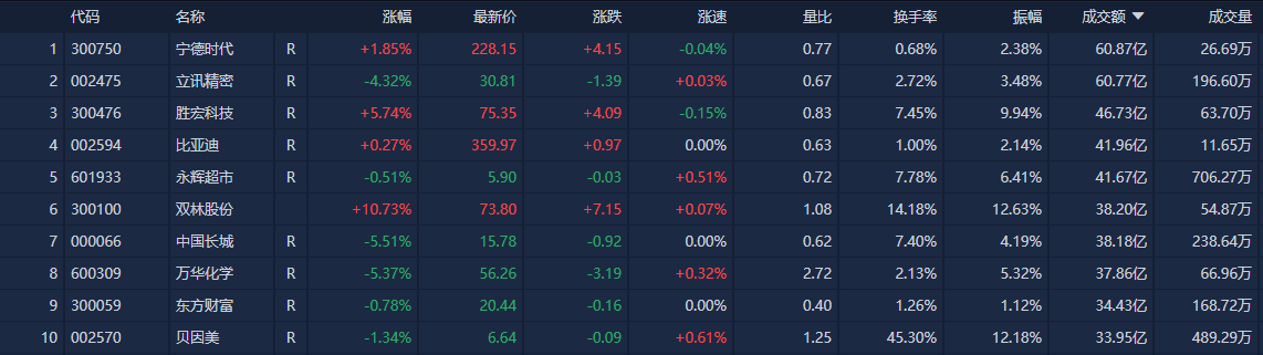 个股方面,宁德时代、立讯精密成交额破60亿元。