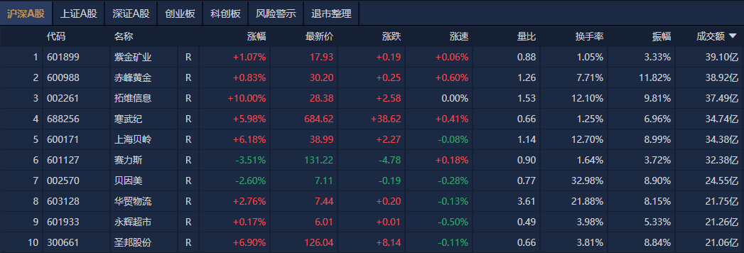 沪深两市半日成交额6173亿元,较上个交易日缩量604亿。个股方面,紫金矿业成交额超39亿元居首,赤峰黄金、拓维信息、寒武纪成交额靠前。