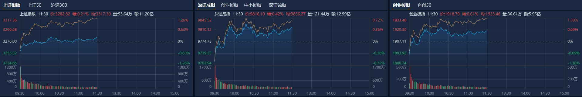 市场早盘低开后震荡反弹,三大指数小幅上涨。南财金融终端显示,截至早盘收盘,沪指涨0.21%,深成指涨0.42%,创业板指涨0.61%。