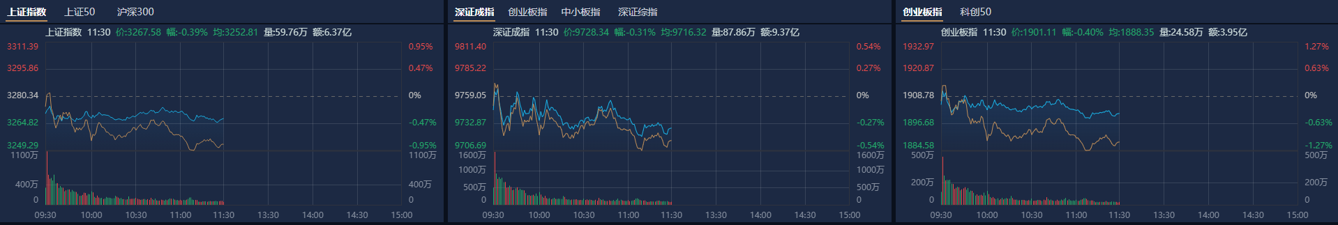 市场早盘震荡调整,三大指数小幅下跌。南财金融终端显示,截至早盘收盘,沪指跌0.39%,深成指跌0.31%,创业板指跌0.4%。
