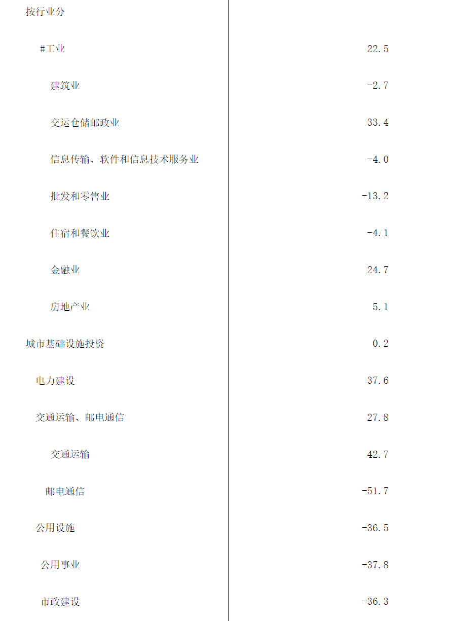 分行业看,工业部门投资增长显著,一季度同比增长22.5%。其中,交通仓储邮政业、金融业和房地产业投资同比分别增长33.4%、24.7%和5.1%。信息传输、软件和信息技术服务业、批发和零售业、住宿和餐饮业、建筑业则同比下降4.0%、13.2%、4.1%和2.7%。