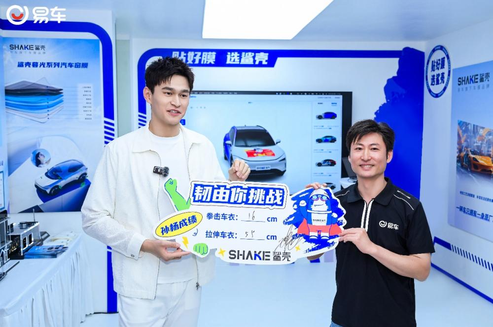 访谈结束,孙杨来到一层展区与现场参观人群亲切问好,并在主持人引领和介绍下参观起易车鲨壳展台。行至互动体验区域,孙杨饶有兴致地体验了鲨壳AI车贴定制过程,更与主持人一道亲身参与了以自己命名的车衣韧性挑战,为后续挑战赛首开纪录,对易车鲨壳车衣产品的性能认知也进一步加深。孙杨的现身与互动掀起了易车鲨壳展台现场活动体验的一波热潮。