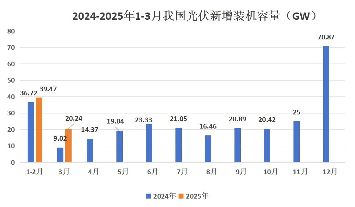 国家能源局最新数据显示,2025年1至3月我国光伏新增装机达59.71GW,同比上升30.5%,其中3月单月光伏新增装机达20.24GW,同比大增。截至3月末,全国太阳能发电装机容量为9.5亿千瓦,同比增长43.4%。