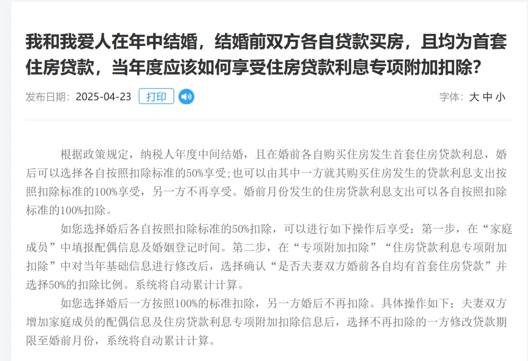 国家税务总局称,根据政策规定,纳税人年度中间结婚,且在婚前各自购买住房发生首套住房贷款利息,婚后可以选择各自按照扣除标准的50%享受;也可以由其中一方就其购买住房发生的贷款利息支出按照扣除标准的100%享受,另一方不再享受。婚前月份发生的住房贷款利息支出可以各自按照扣除标准的100%扣除。