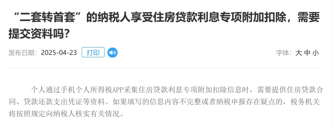问:“二套转首套”的纳税人享受住房贷款利息专项附加扣除,需要提交资料吗?