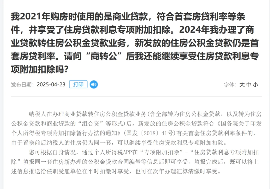 问:我2021年购房时使用的是商业贷款,符合首套房贷利率等条件,并享受了住房贷款利息专项附加扣除。2024年我办理了商业贷款转住房公积金贷款业务,新发放的住房公积金贷款仍是首套房贷利率。请问“商转公”后我还能继续享受住房贷款利息专项附加扣除吗?