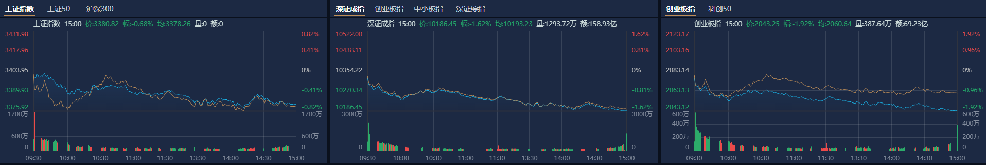 市场全天震荡调整,创业板指领跌。南财金融终端显示,截至收盘,沪指跌0.68%,深成指跌1.62%,创业板指跌1.91%。