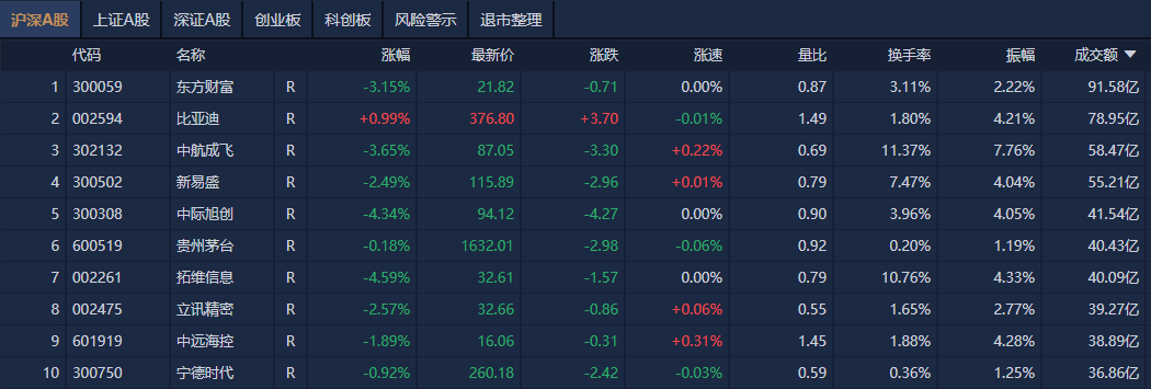 沪深两市全天成交额1.15万亿元,较上个交易日缩量1643亿。个股方面,东方财富成交额超91亿元居首,比亚迪、中航成飞、新易盛成交额靠前。