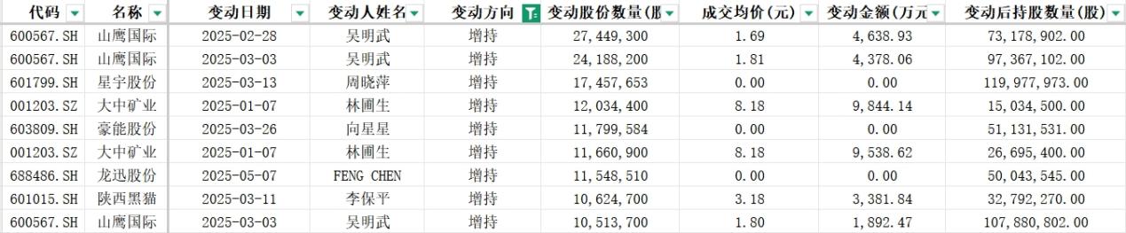 从变动股份数量来看,有7家公司的6位高管增持股份数量超过千万股,包括山鹰国际总裁吴明武、星宇股份股东周晓萍、大中矿业总经理林圃生、豪能股份董事向星星、龙迅股份董事FENG CHEN、陕西黑猫实控人李保平。