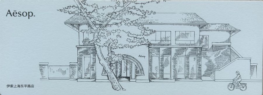 记者在闭店前来到这家位于上海徐汇衡复历史文化风貌区核心地段的门店,收到一张卡片,一面印着东平路店的速写,一面是手写的文字:“作为许多人初识Aesop伊索的地方,这间门店如同一座小小的灯塔,温柔地照亮彼此相遇的轨迹……”