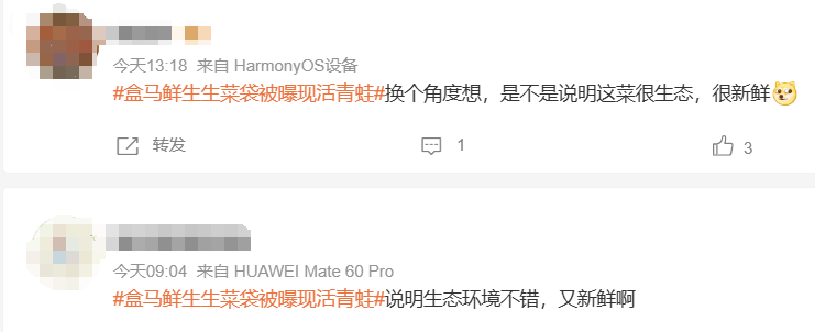 有网友认为说明“很新鲜”“很生态”,也有网友盒马质量把关有待提高。