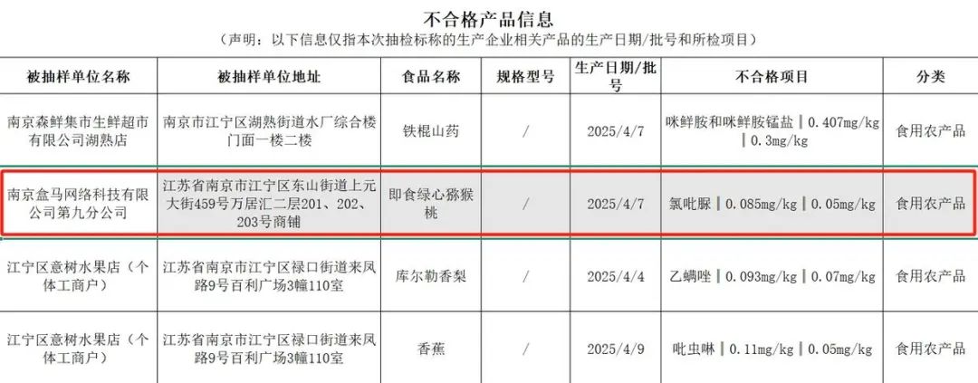 其中,南京盒马网络科技有限公司第九分公司销售的即食绿心猕猴桃(生产日期/批号:2025/4/7),氯吡脲不符合食品安全国家标准规定,检验结果为0.085mg/kg,标准值规定为0.05mg/kg。