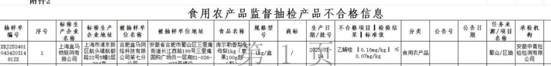 合肥盒马网络科技有限公司第七分公司销售的库尔勒香梨全母梨1kg(单果100g起)(生产日期/批号:2025/01/14),乙螨唑指标不符合食品安全国家标准规定,检验结果为0.16mg/kg,标准值规定0.07mg/kg。