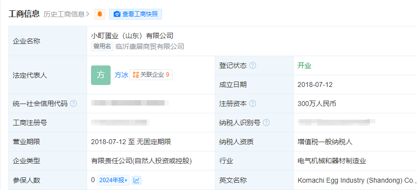 天眼查显示,青岛盒马网络科技有限公司潍坊分公司于2024年12月28日开业,是盒马鲜生鲁中首店。小町蛋业(山东)有限公司成立于2018年7月12日,注册资本300万元,股东杨连生和杨伶俐各持股50%。