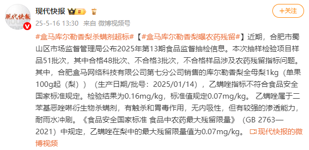 近日,继潍坊门店无抗鸡蛋兽药超标与猕猴桃被检出膨大剂超标事件后,盒马合肥门店销售的库尔勒香梨被检出农药残留。