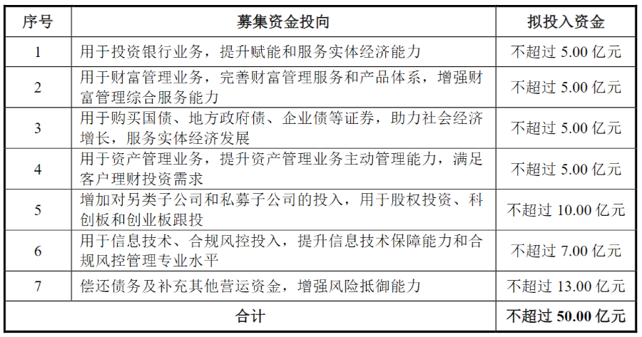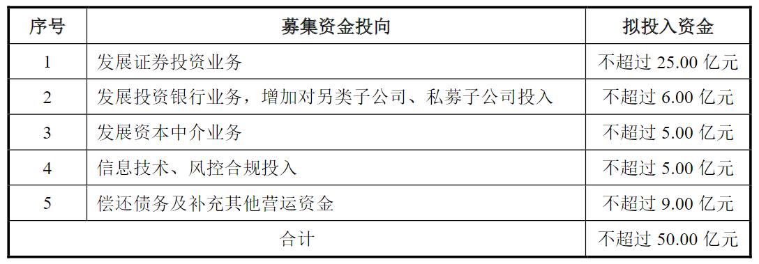 其余25亿元中,5亿元用于发展资本中介业务,5亿元用于信息技术及合规风控投入,6亿元用于发展投资银行业务、增加对另类子公司和私募子公司投入,9亿元用于偿还债务及补充其他营运资金。