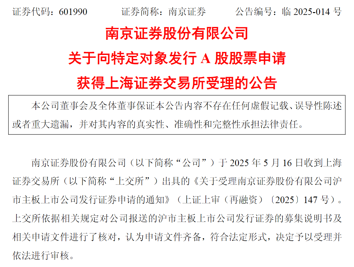 近日,南京证券发布公告称,公司于2025年5月16日收到上交所出具的《关于受理南京证券股份有限公司沪市主板上市公司发行证券申请的通知》。上交所决定予以受理并依法进行审核。本次定增事项尚需经上交所审核通过并报中国证监会同意注册后方可实施。