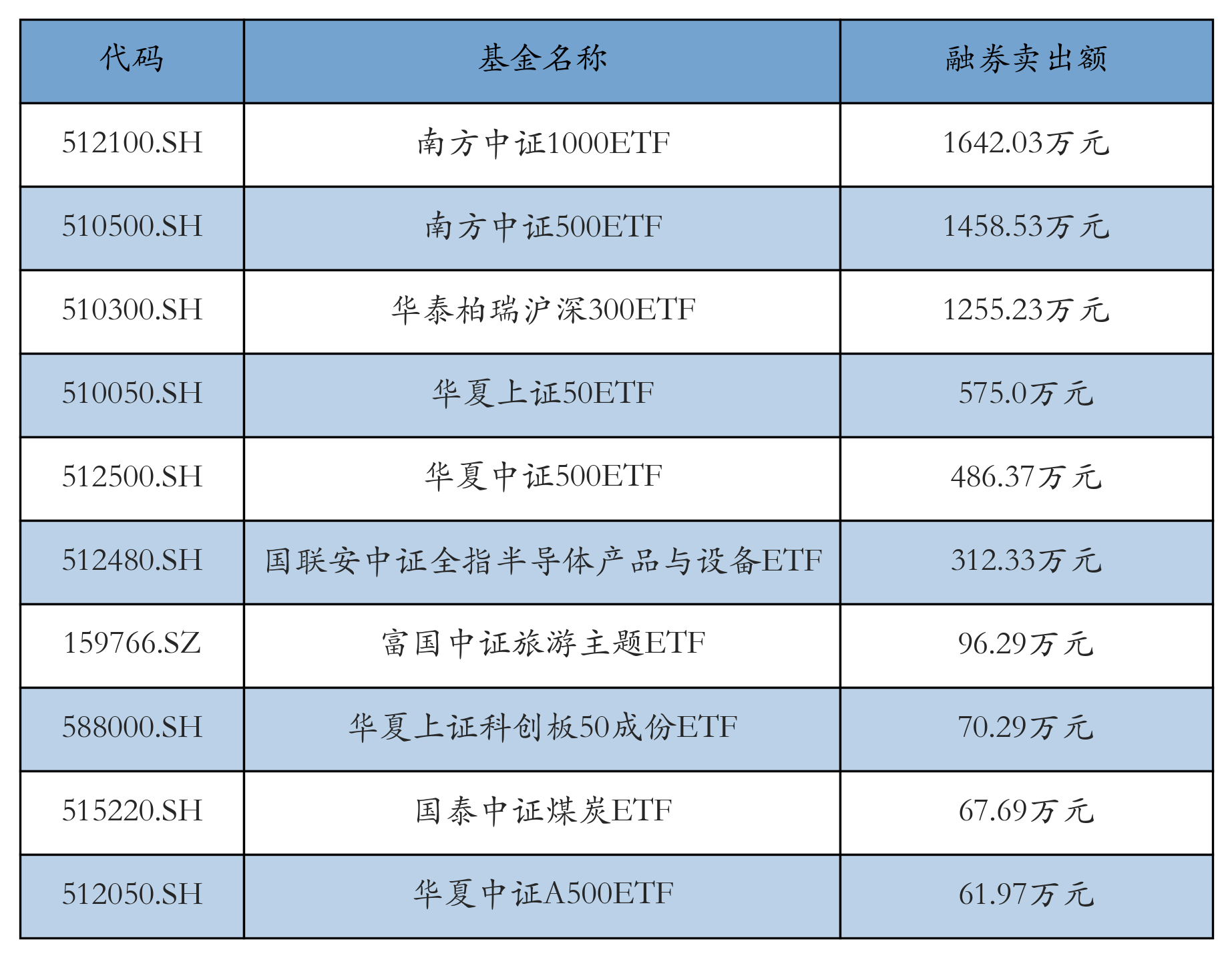 5月22日ETF融券卖出额前三位分别为:南方中证1000ETF(1642.03万元)、南方中证500ETF(1458.53万元)和华泰柏瑞沪深300ETF(1255.23万元),前10具体见下表: