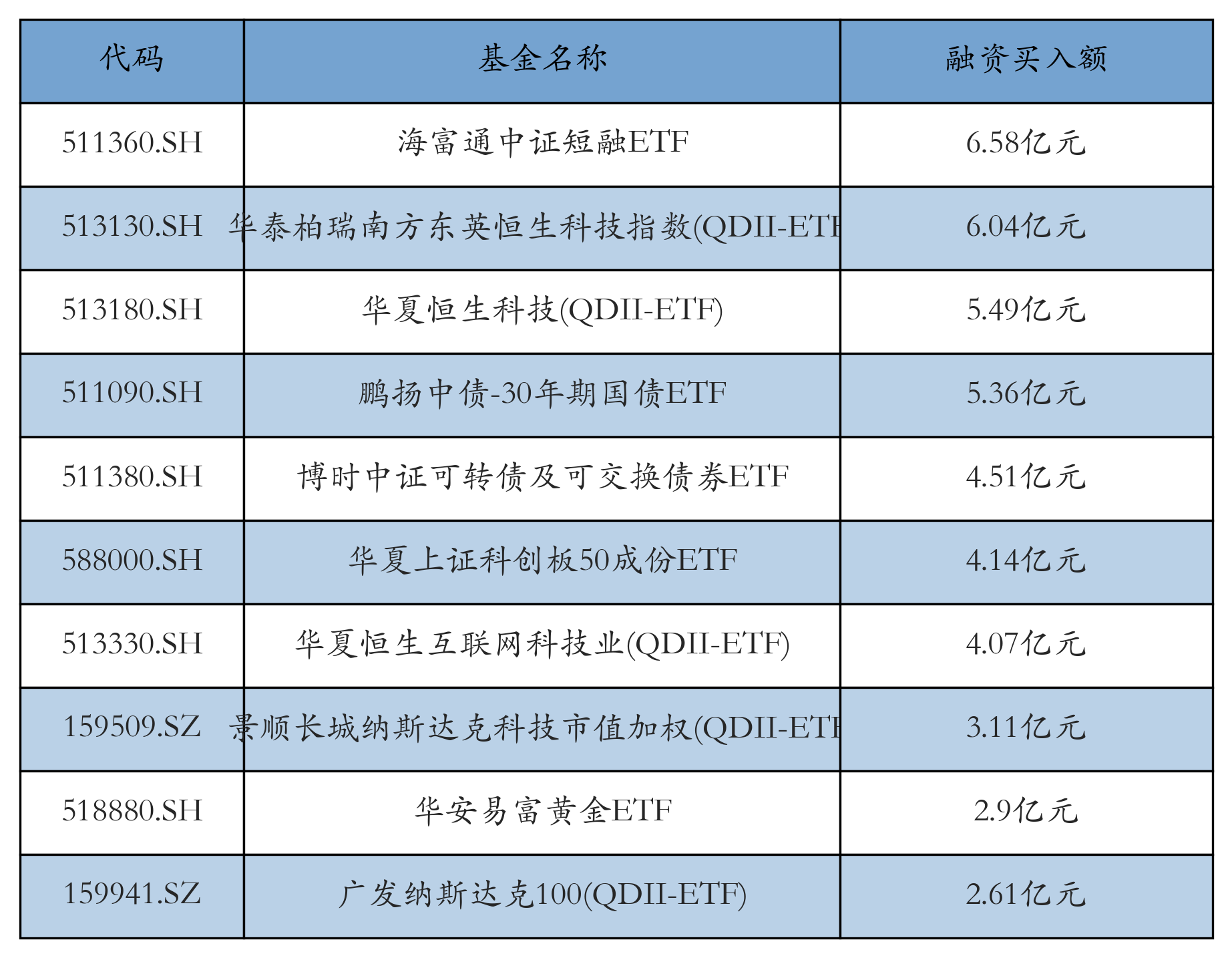 5月22日ETF融资买入额前三位分别为:海富通中证短融ETF(6.58亿元)、华泰柏瑞南方东英恒生科技指数(QDII-ETF)(6.04亿元)和华夏恒生科技(QDII-ETF)(5.49亿元),前10具体见下表: