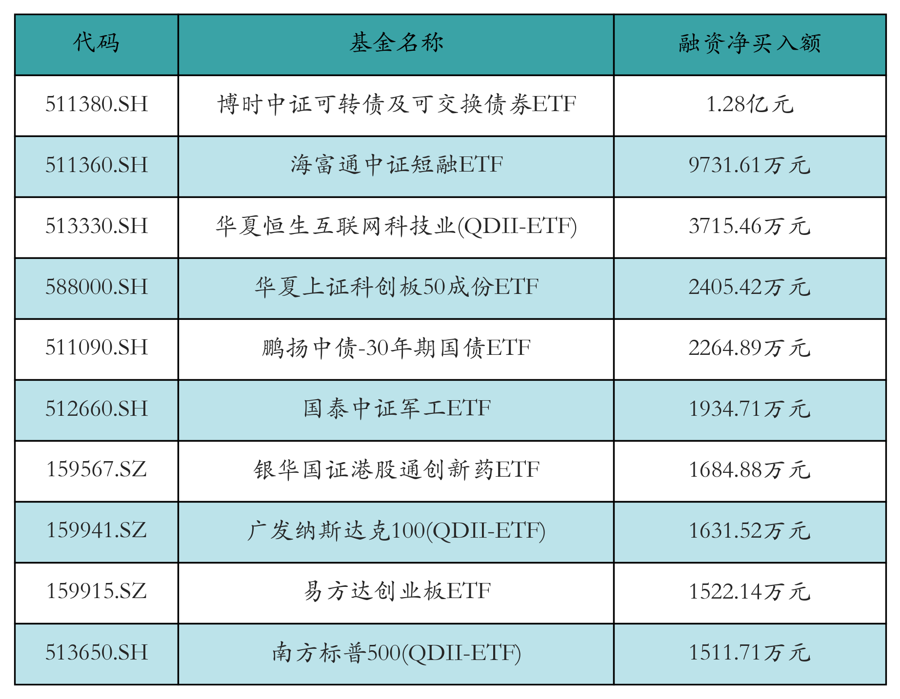 5月22日ETF融资净买入额前三位分别为:博时中证可转债及可交换债券ETF(1.28亿元)、海富通中证短融ETF(9731.61万元)和华夏恒生互联网科技业(QDII-ETF)(3715.46万元),前10具体见下表: