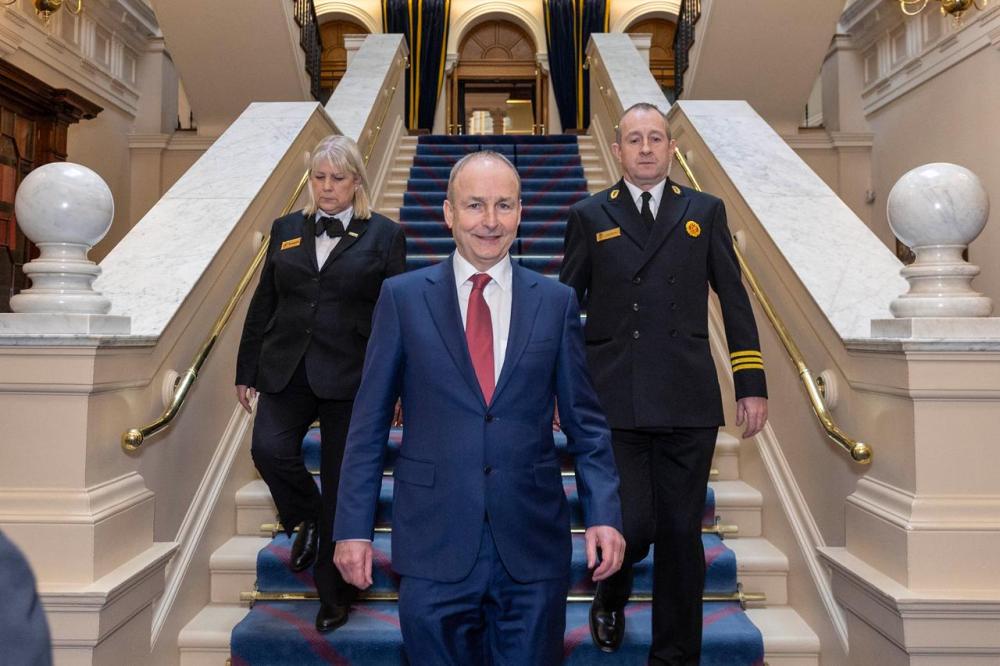 1月23日,在爱尔兰都柏林,米歇尔·马丁(前)离开议会。新华社发(爱尔兰议会供图)