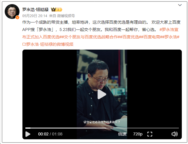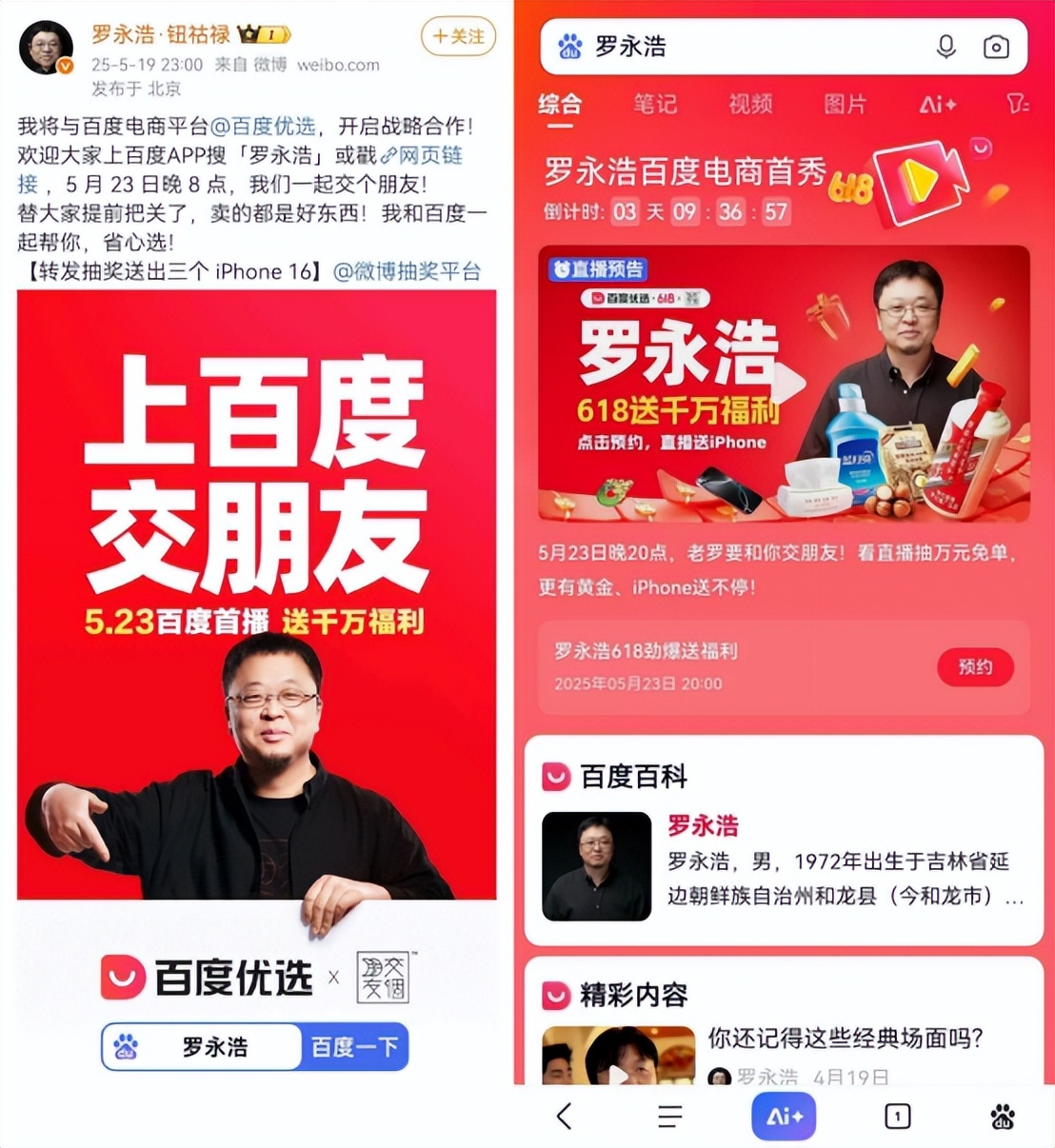 如今,双方已经明确将进行直播带货合作,考虑到618大促临近,罗永浩作为头部主播,其与百度优选的合作也并不让人感到意外。