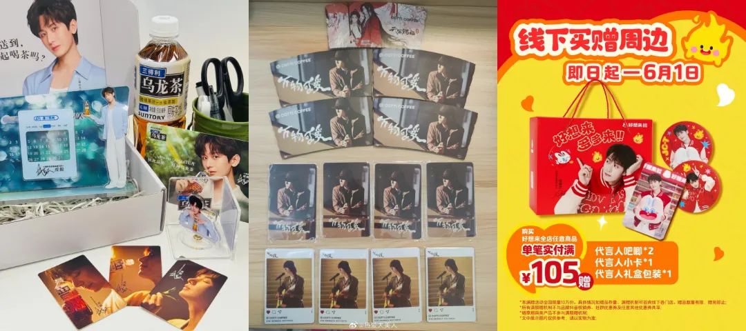 据统计,2024年上半年,品牌官宣代言人数量同比2022年上涨61.9%,同年8月,共有197个品牌与207位艺人官宣新合作,但出圈案例并不多。为了和粉丝产生更深度的互动和情感连接,品牌往往会推出限定礼盒、周边,近半年内,就有瑞幸、库迪、三得利等近十个品牌推出了代言人小卡。