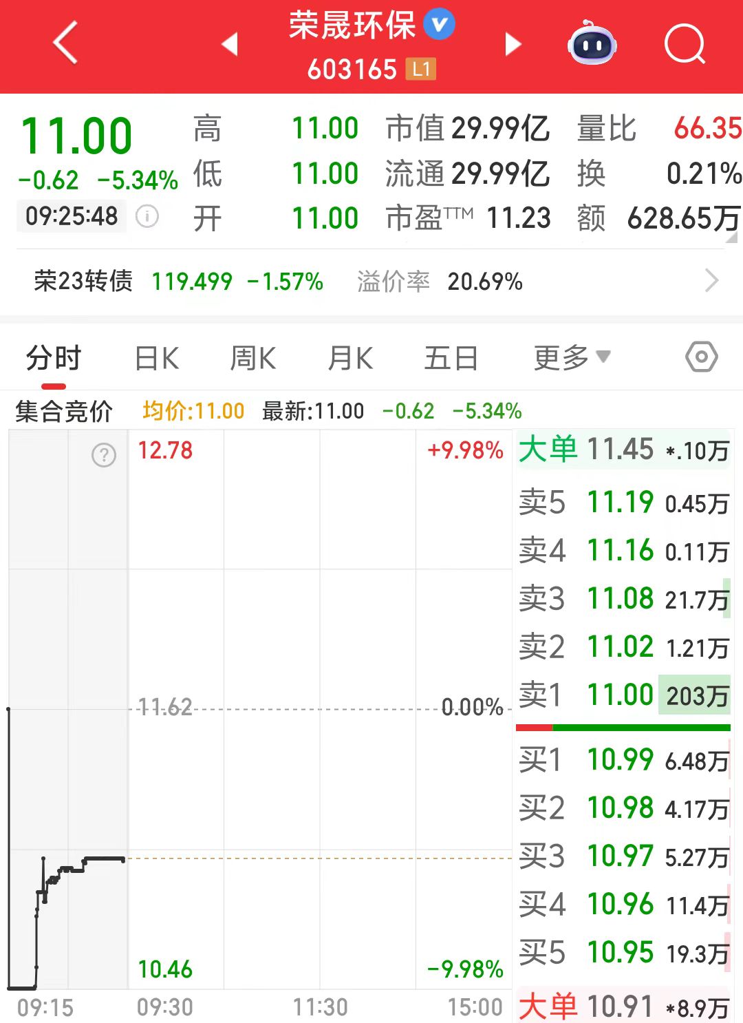 5月27日,纸业上市公司荣晟环保(603165.SH)开盘大跌5.34%,报11元/股,总市值报29.99亿元。