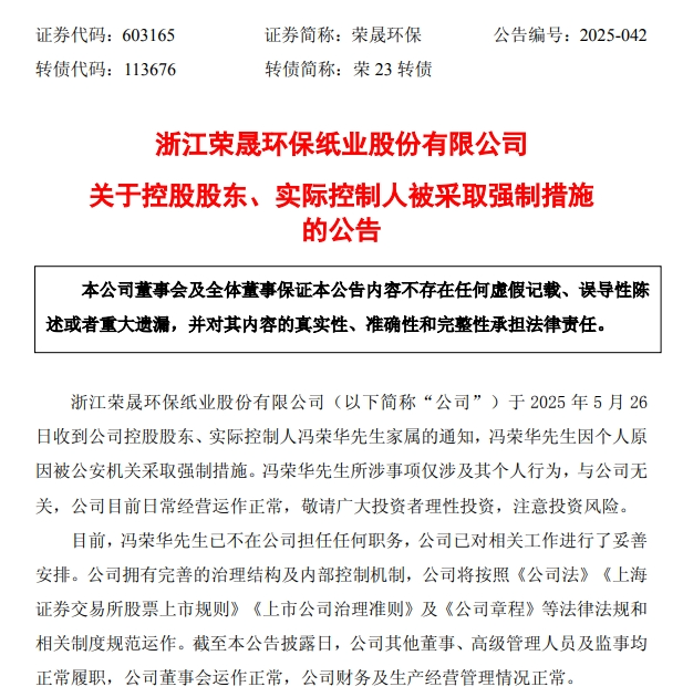 “冯荣华所涉事项仅涉及其个人行为,与公司无关,公司目前日常经营运作正常。”荣晟环保在公告中表示,“目前,冯荣华已不在公司担任任何职务,已对相关工作进行了妥善安排。”