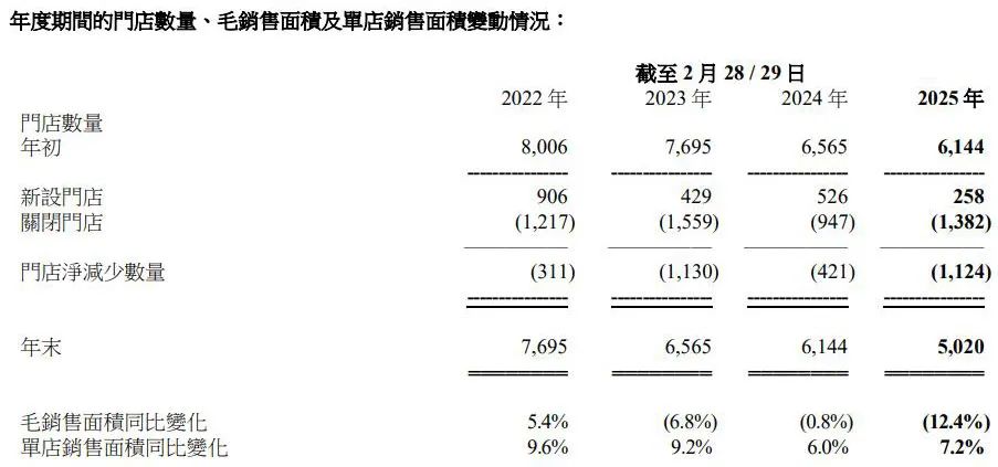 截至2月底,其共运营5020家直营店铺,店铺总数同比减少18.3%,毛销售面积则减少12.4%,大量店铺的关闭,集中在2024年9月之后。