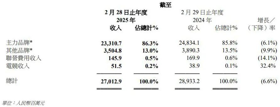 2025财年,两大主力品牌销售为233.1亿元,占到总收入86.3%,对比上年,减量15亿元左右。