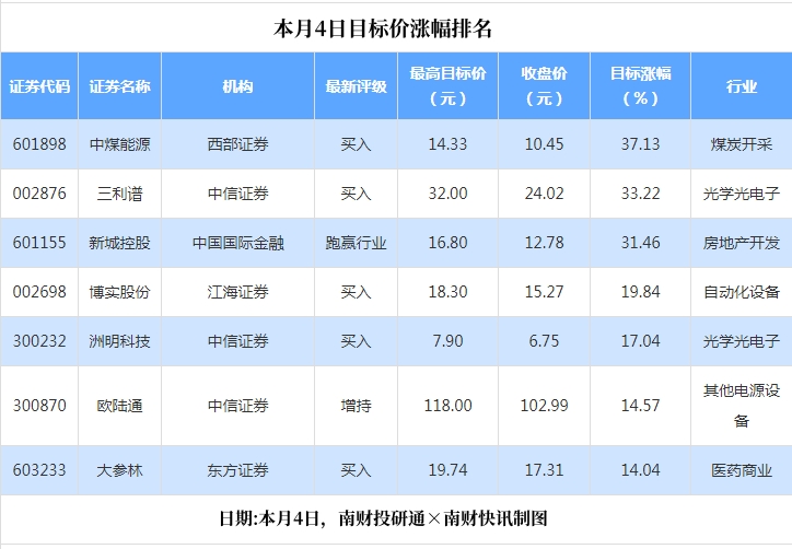 4日,券商给予上市公司目标价共7次,按当日收盘价计算,目标价涨幅排名居前的公司有中煤能源、三利谱、新城控股,目标价涨幅分别为37.13%、33.22%、31.46%,分别属于煤炭开采、光学光电子、房地产开发行业。