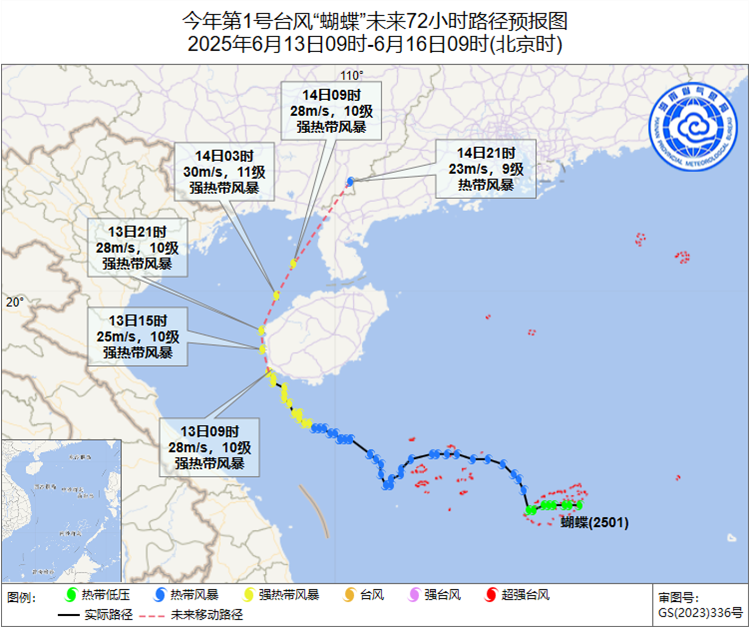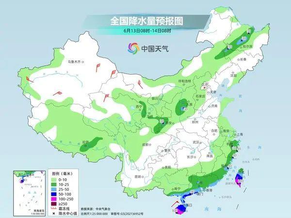 6月13日8时至14日8时,广西南部、广东中南部、海南岛、福建东部、浙江东部、台湾岛等地部分地区有大到暴雨,其中,海南岛南部、台湾岛南部等地部分地区有大暴雨,局地特大暴雨(250~400毫米)。上述部分地区伴有短时强降水(最大小时降雨量20~50毫米,局地可超过70毫米),局地有雷暴大风等强对流天气。