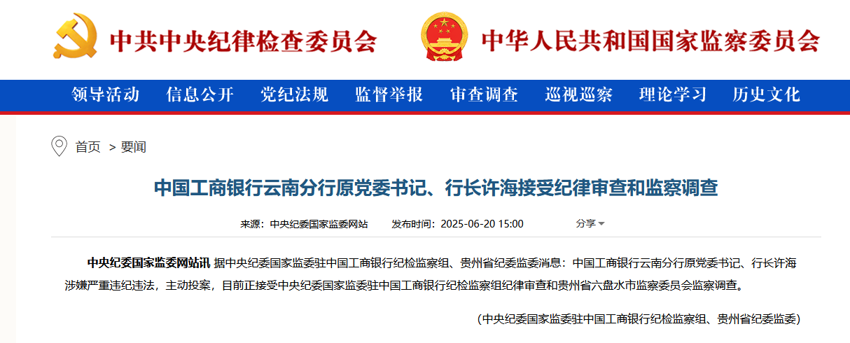 据中央纪委国家监委驻中国工商银行纪检监察组、贵州省纪委监委消息:中国工商银行云南分行原党委书记、行长许海涉嫌严重违纪违法,主动投案,目前正接受中央纪委国家监委驻中国工商银行纪检监察组纪律审查和贵州省六盘水市监察委员会监察调查。