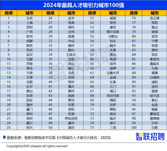 智联招聘与泽平宏观联合发布的《中国城市人才吸引力排名:2025》报告显示,应届生和硕士及以上人才依旧更倾向往一二线城市集聚。应届生人才流入一二线城市合计占比66.1%,高于整体人才流入占比的58.2%。