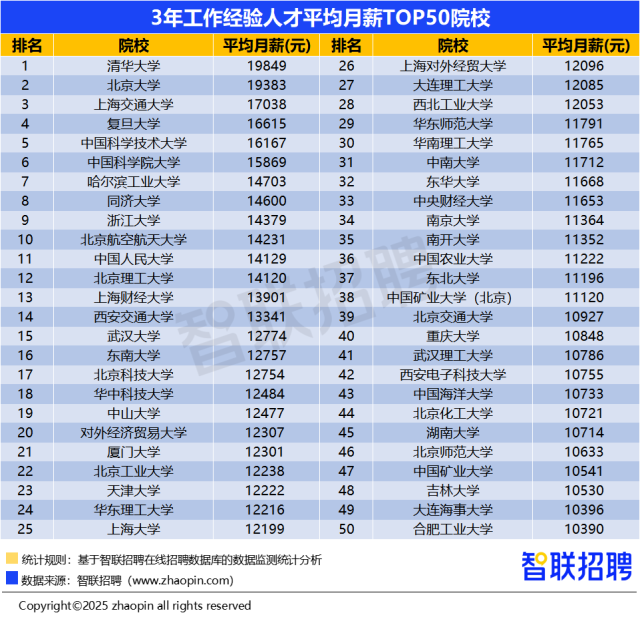 对于家长和考生来说,毕业后的薪资是志愿填报的重要考量因素。智联招聘数据显示,在“3年工作经验人才平均月薪TOP50院校”中,排名前10位的院校与上一年相同,具体名次略有变化,“清北复交”占据了薪酬榜前4名,头部名校的月薪金额相差不大。