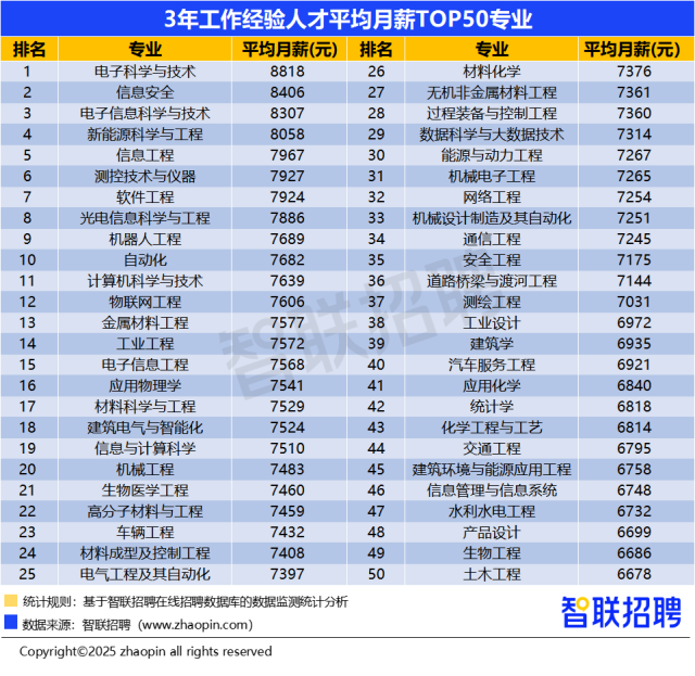专业薪资排名中,理工类专业优势仍然明显。在“3年工作经验人才平均月薪TOP50专业”里,“机器人工程”作为新上榜的专业,跻身前十席位,这与近年来人工智能机器人的开发与运用有密切关联。