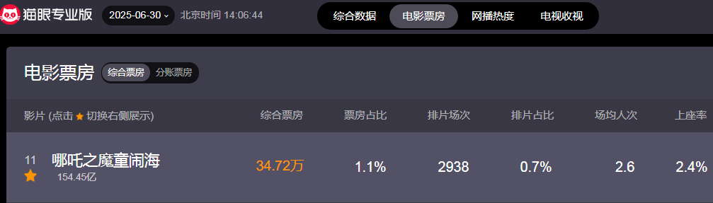 据猫眼专业版数据,电影《哪吒之魔童闹海》密钥将于今日(6月30日)到期,累计总票房154.4亿元,总观影人次3.24亿,上映至今共打破113项纪录,获得308项里程碑成就。主要成就:
