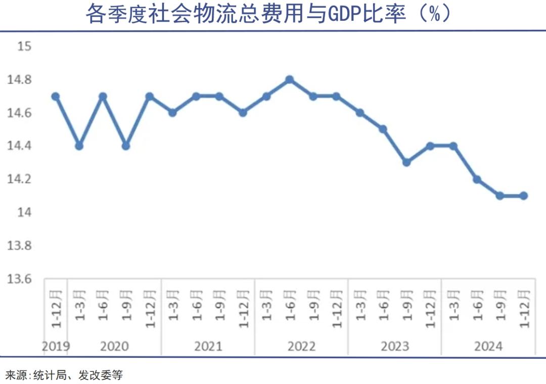 社会物流总成本在GDP中的比重,是衡量一个国家商品流通效率的关键指标。2024年,我国社会物流总费用与GDP的比值为14.1%,已降至2006年有统计以来的最低水平。