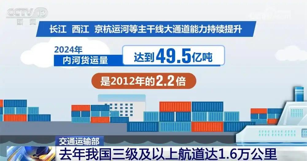 交通运输部最新数据显示,2024年,我国三级及以上的航道里程达到1.6万公里,比2012年增长了62%,内河亿吨大港23个,是2012年的2.3倍;内河货运量49.5亿吨,是2012年的2.2倍。