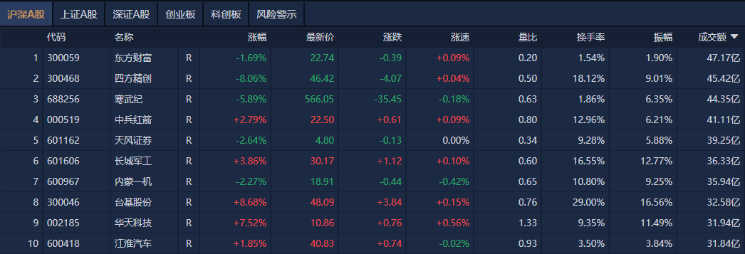 沪深两市半日成交额9606亿元,较上个交易日放量463亿。个股方面,东方财富成交额超47亿元居首,四方精创、寒武纪、中兵红箭成交额靠前。