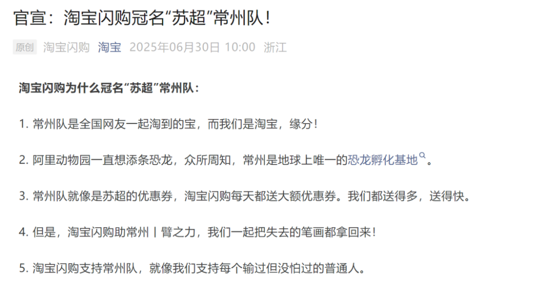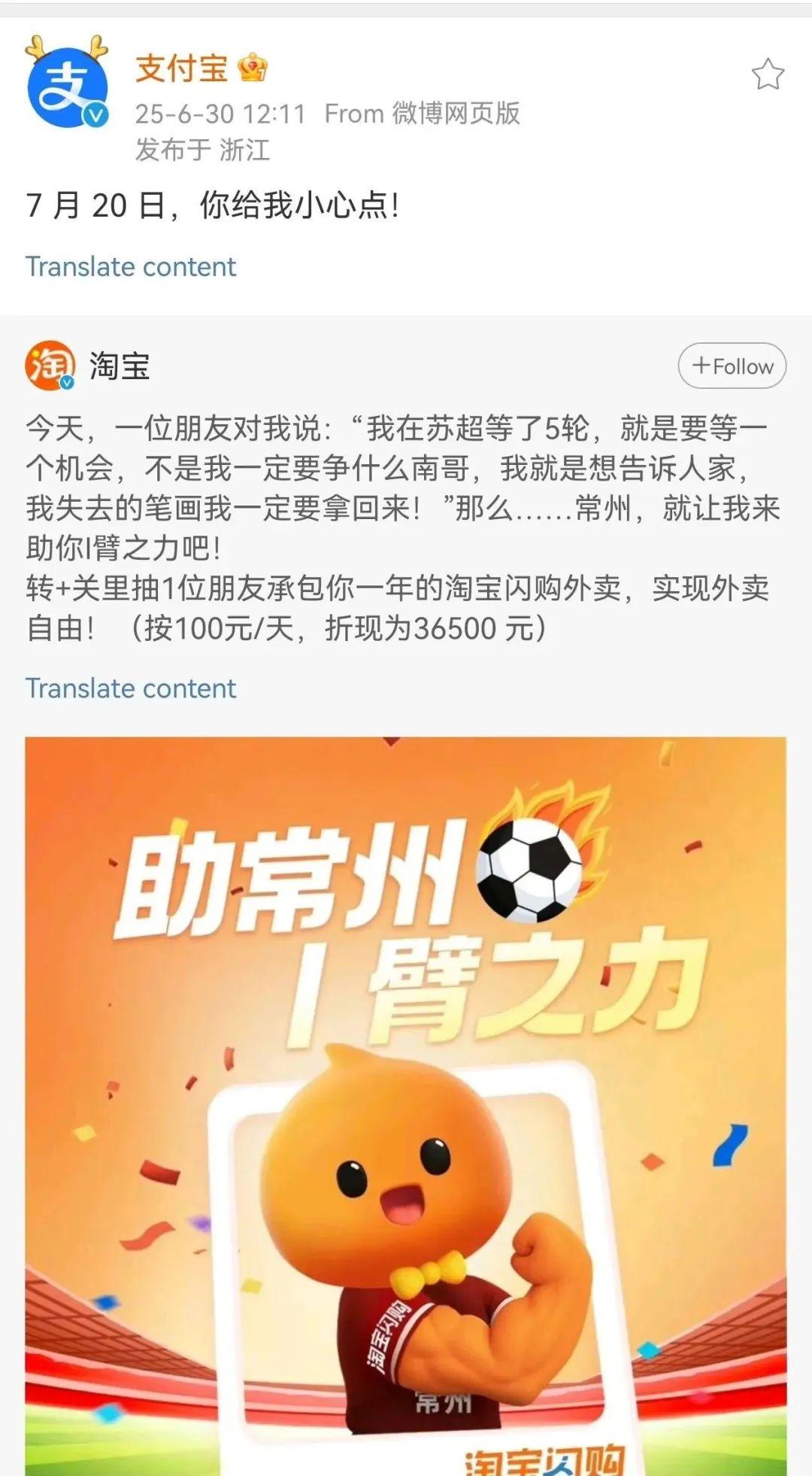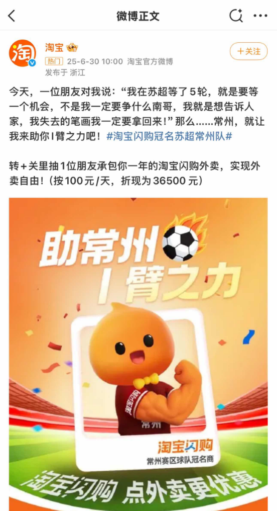 6月30日上午10点,淘宝闪购宣布冠名“苏超”联赛垫底球队常州队,有人说常州送积分太狠了,淘宝闪购送优惠券,首席觉得淘宝要助力“川”队回归“常州”队!