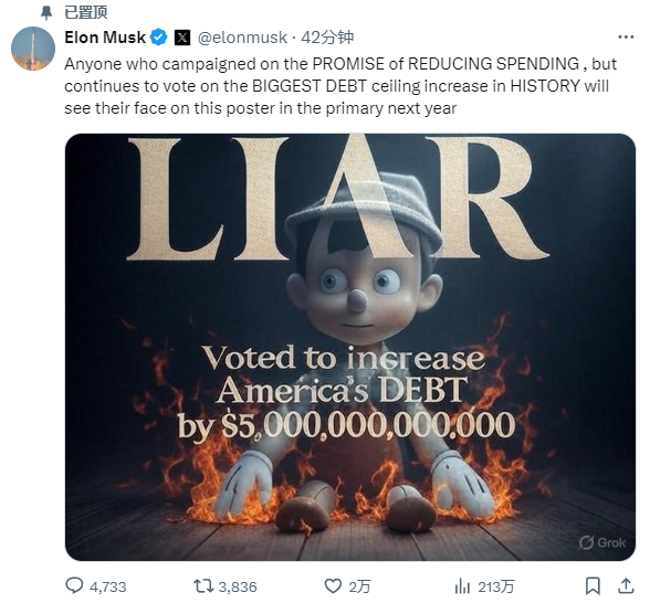6月30日晚,马斯克再次在社交平台上发文批评该法案,还配发一张童话人物匹诺曹的图片称,任何以削减开支的承诺参与竞选,却投票支持历史上最大债务上限增加的国会议员,都会在明年的初选中看到自己出现在海报上,并被打上“骗子”的标签。马斯克还表示,特朗普的“大而美”法案会让美国当前的债务再增加5万亿美元。
