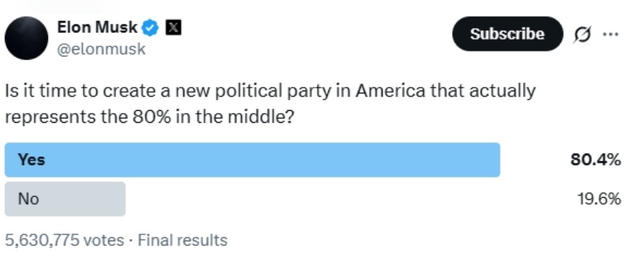 6月5日,马斯克首次提出这一想法。他在社交平台X上向2.2亿粉丝发起投票,询问是否同意“是时候在美国创建一个真正代表80%中间派的新政党了”。调查结果显示,超过80%的投票者都选择“是”。马斯克6日晚间发文称:“这是命运。”随后,马斯克还表示赞同一位粉丝提出的党名建议——“美国党”(America Party)。