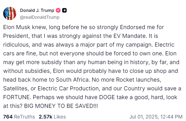 特朗普在帖文中称,“埃隆·马斯克在强力支持我竞选总统之前,早就知道我强烈反对‘电动汽车强制令’。这太荒谬了,这一直是我竞选活动的主要部分。电动汽车没问题,但不应该强迫每个人都拥有一辆。埃隆获得的补贴可能远远超过历史上任何一个人。如果没有补贴,埃隆可能不得不关门大吉,回到南非老家。不再有火箭发射、卫星或电动汽车生产,我们的国家将节省一大笔钱。也许我们应该让政府效率部好好查查?这能省下一大笔钱!”