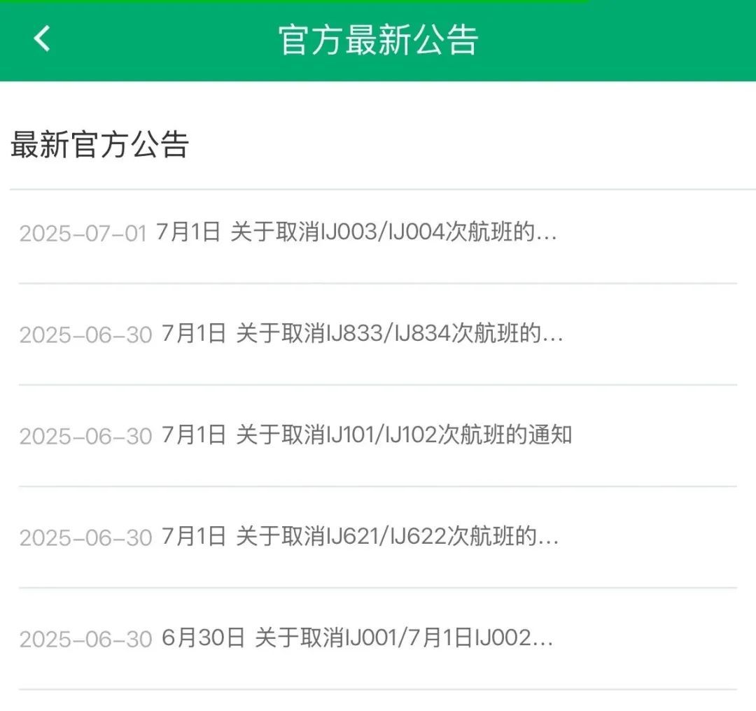 据春秋航空官网最新公告显示,7月1日春秋航空日本多批次航班取消,包括IJ001次航班由东京(成田)飞往上海(浦东)、IJ002次航班由上海(浦东)飞往东京(成田)等,取消原因均是“因受运力调配影响”。
