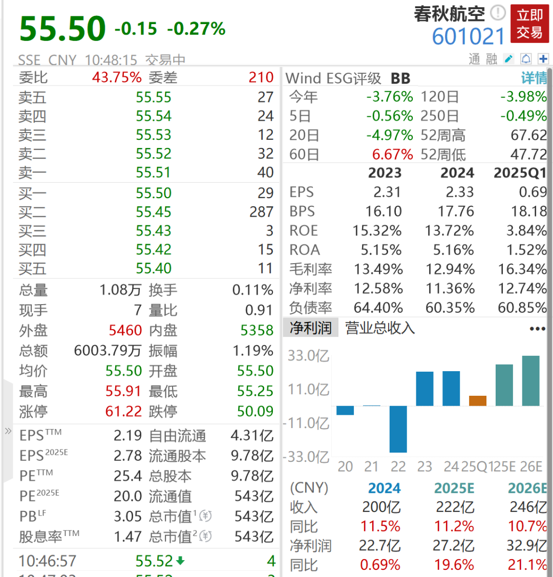 市场上,7月1日,截至10:49,春秋航空股价微跌,报55.5元/股。