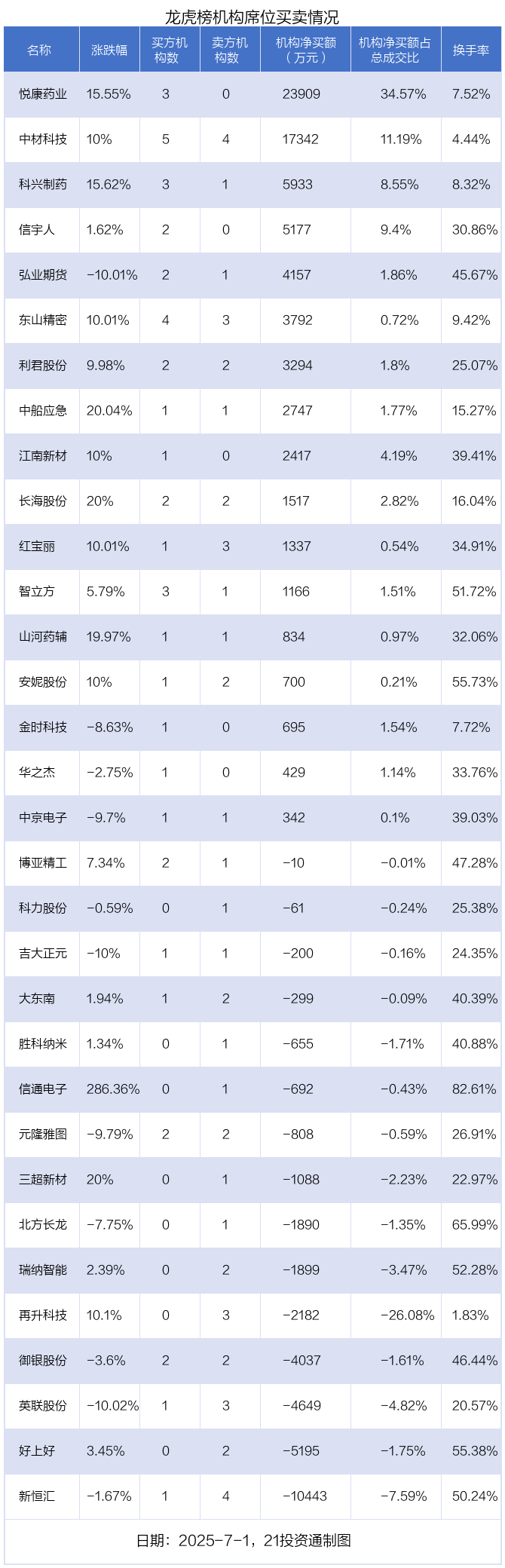 7月1日,32只个股龙虎榜出现了机构的身影,机构合计净买入4.17亿元。具体来看,机构净买入17股,净卖出15股。